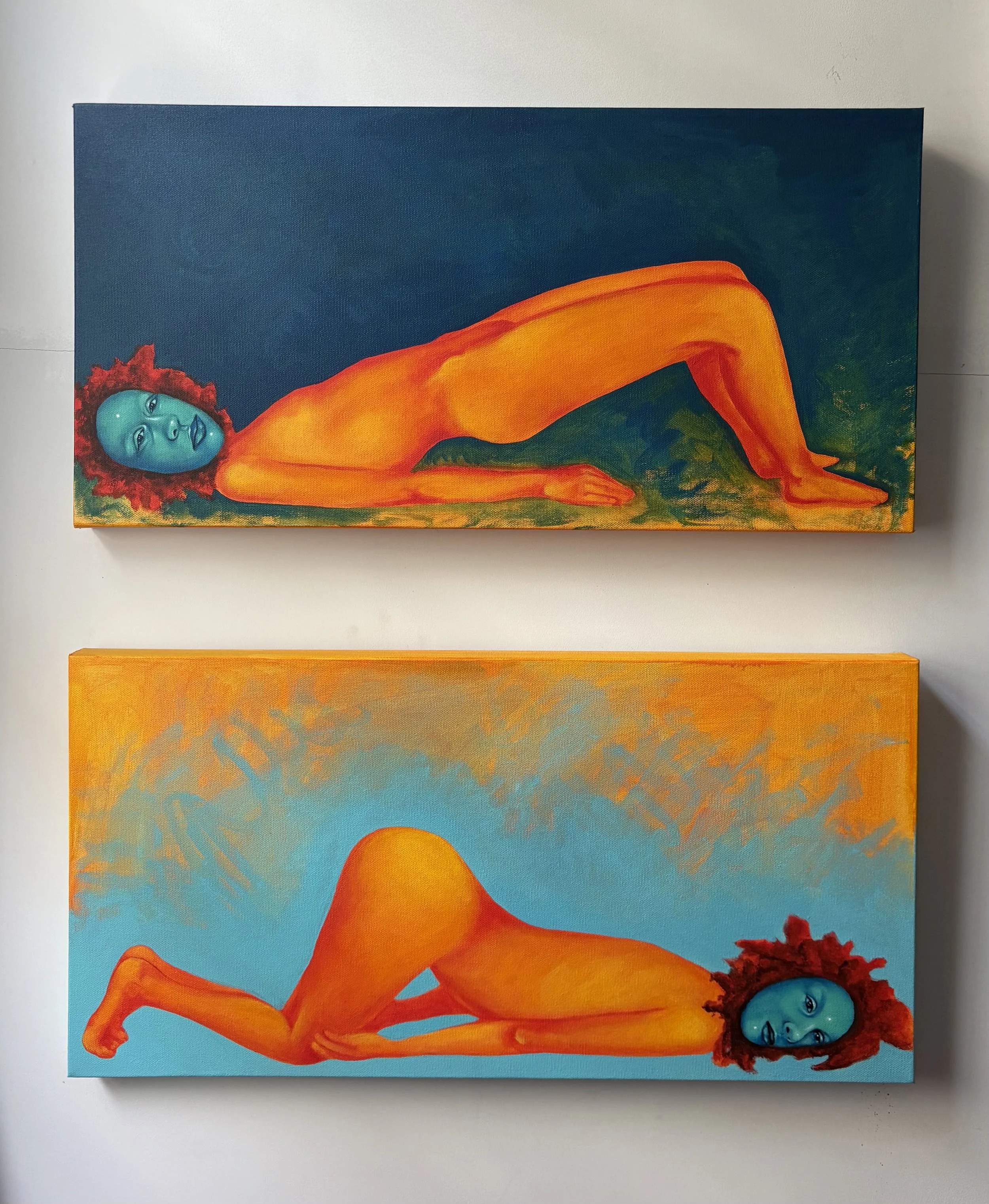 The Duality of Self is a collection of recent paintings that loosely explores the themes of human complexity and conflicting emotions/behaviors within us all. The series is completed through various diptychs and paintings consisting of two figures expressing opposite points of contrast within one being. Inspired by the heightened attributes and stereotypes assigned to my character at birth as a Gemini, this exhibition pushes to encourage the malleability and fluidity of humans in general, regardless of astrological placements. Each change in thought, feeling, or expression is just as valuable as the next, all coinciding within you, even if they go unnoticed to the public eye. There is more than one way to be yourself.